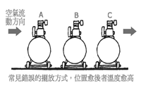 机C所吸入的是空压机B所排放的热气,空压机机体温度比为C>B>A,若多机并排,除放置在第一的空压机外,其余空压机皆无法