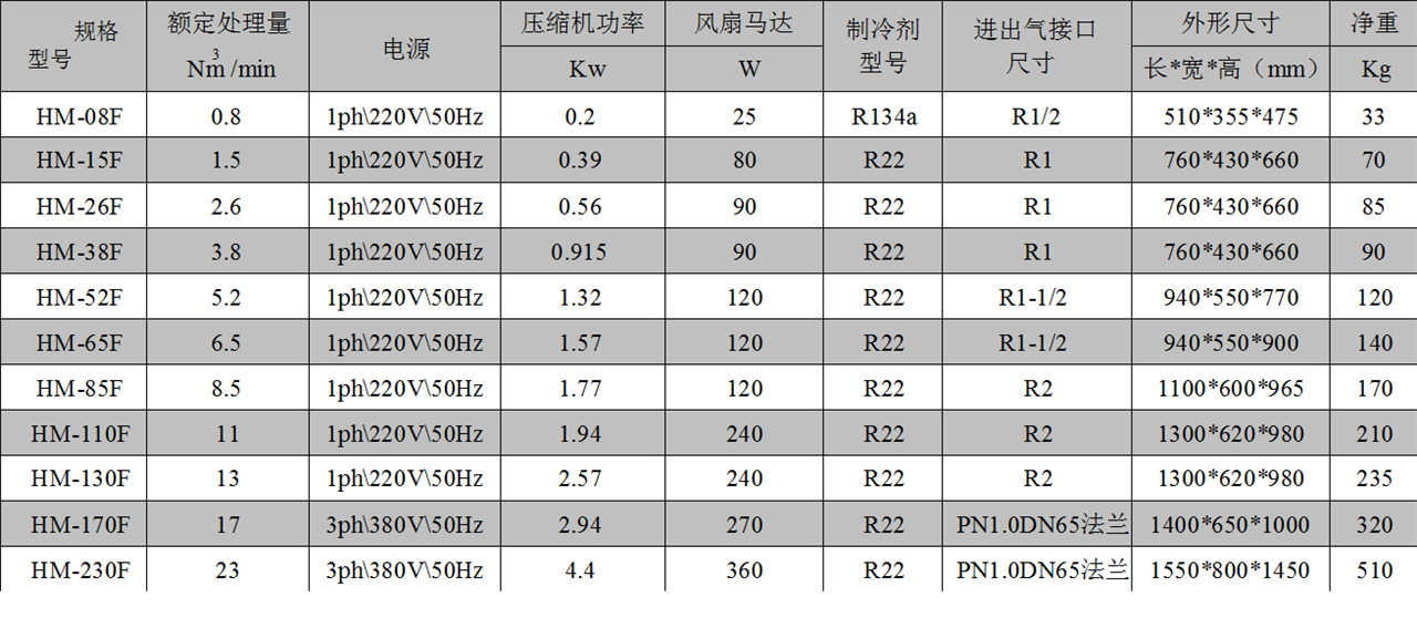 冷干机性能参数